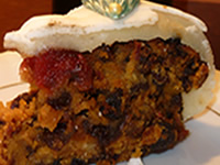 Homemade rich fruit cake with REAL brandy - aged, iced with white icing and including a few decorations. Served on silver cake board. 8" dia cake